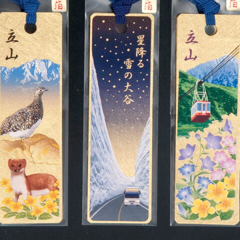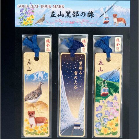 立山黒部の旅3点セット ■サイズ:140×170mm(台紙を含む) ■PETフィルムに片面本金箔貼り仕様 ● 富山・黒部の名所・風景・風物詩が一目でわかる金箔のしおりです。